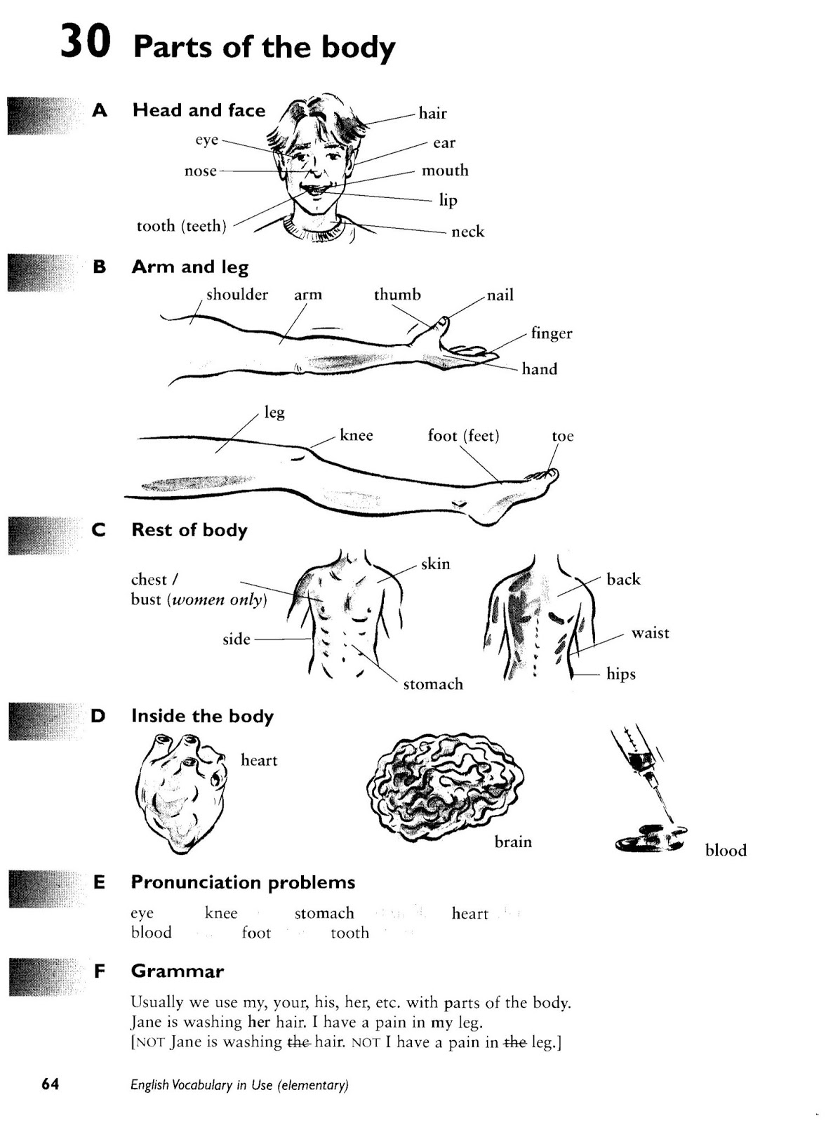 Unit 30: Parts of the body - Vocabulary in Use Elementary Nằm trong cuốn sách Vocabulary in use Elementary giúp người học tiếng Anh bổ sung vốn từ vựng lớn. Sách được thiết kế theo từng chủ đề nhất định, nhờ thế mà người học có thể bao quát tất cả những vấn đề cần thiết, trang bị vốn từ và cấu trúc từ cần thiết. Nên học từng bài một, không nhất thiết học theo thứ tự, nhưng sách sẽ được thiết kế theo dạng từ dễ đến khó.